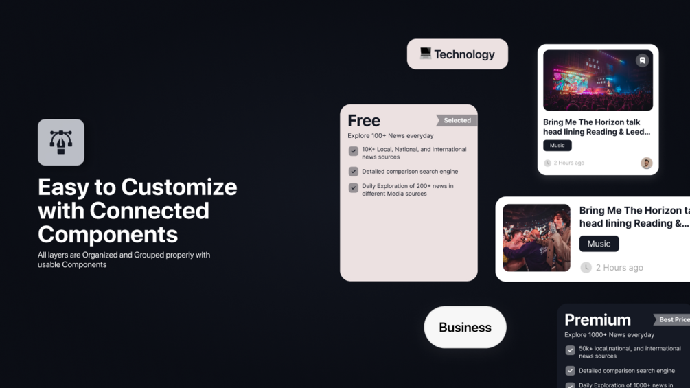 The News App UI Kit is a user interface (UI) kit specifically designed for news applications. The kit contains various design elements such as icons, buttons, and screen templates that can be used to facilitate the process of designing news application